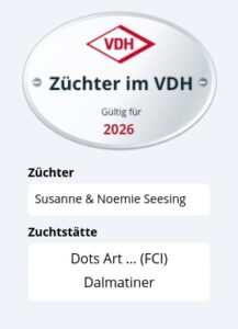 Wir züchten nach hohen Anforderungen entsprechend dem Regelwerk des Verbands für das Deutsche Hundewesen (VDH). Der VDH ist an den Dachverband Fédération Cynologique Internationale (FCI) angegliedert. Zudem sind wir Mitglieder bei der Dalmatiner Zucht Gemeinschaft Deutschland e.V. (DZGD).
